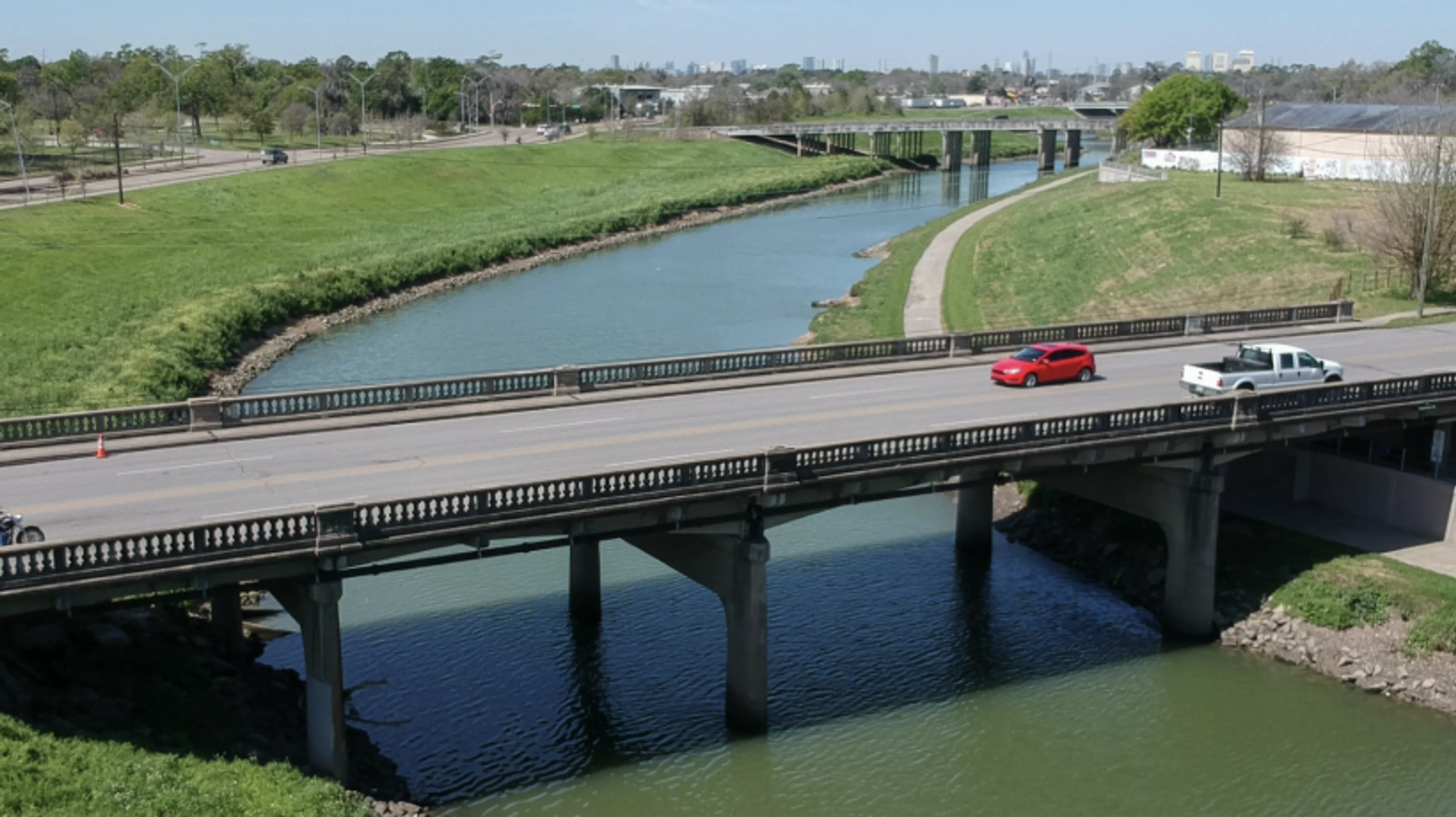 The installation shown monitors bayou and drainage canal levels in Houston, Texas. For comparison, the legacy system beside it includes a large control panel, oversized solar array, and bulky transmitter equipment.